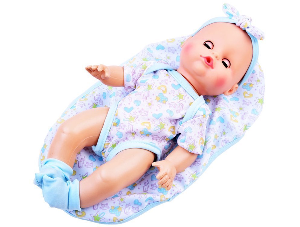 - niebieska zabawka dla dziecka, lalka niemowlak, zabawa z lalą