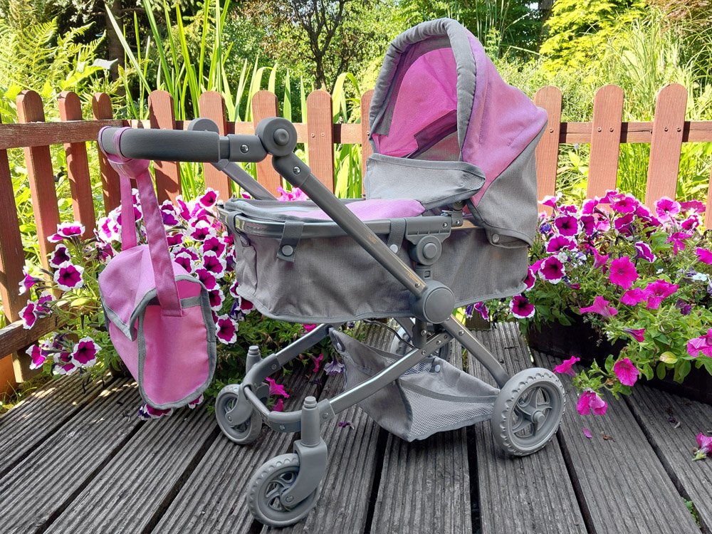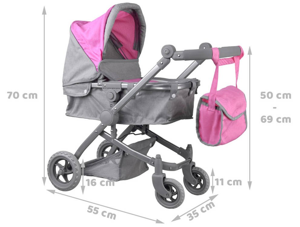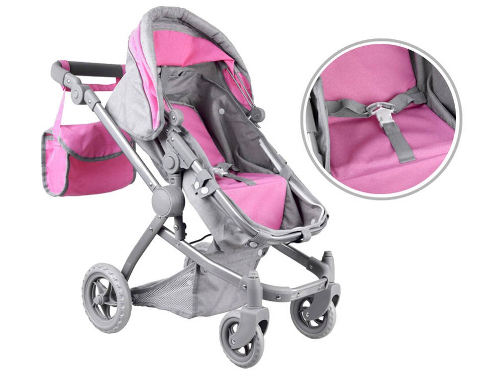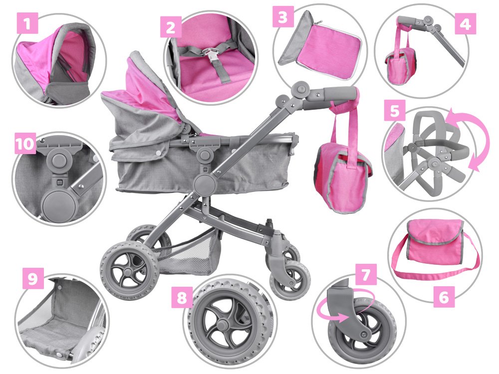 Duży, zwrotny wózek typu gondola z opcją 4w1 dla najmłodszych zachwyci każdą małą opiekunkę lalek i misiów i innych przytulaków. Wózek bardzo starannie i dokładnie wykonany, z lekkiej konstrukcji. Jego atutem jest to iż mając jeden wózek można go przekształcić z głębokiego wózka na spacerowy, bez żadnych dodatkowych koszów, przepinek. W łatwy sposób dzięki paru zatrzaskom przekształcamy gondole w wózek spacerowy. Lekka konstrukcja pozwoli na płynne prowadzenie go przez małą dziewczynkę lub chłopczyka.